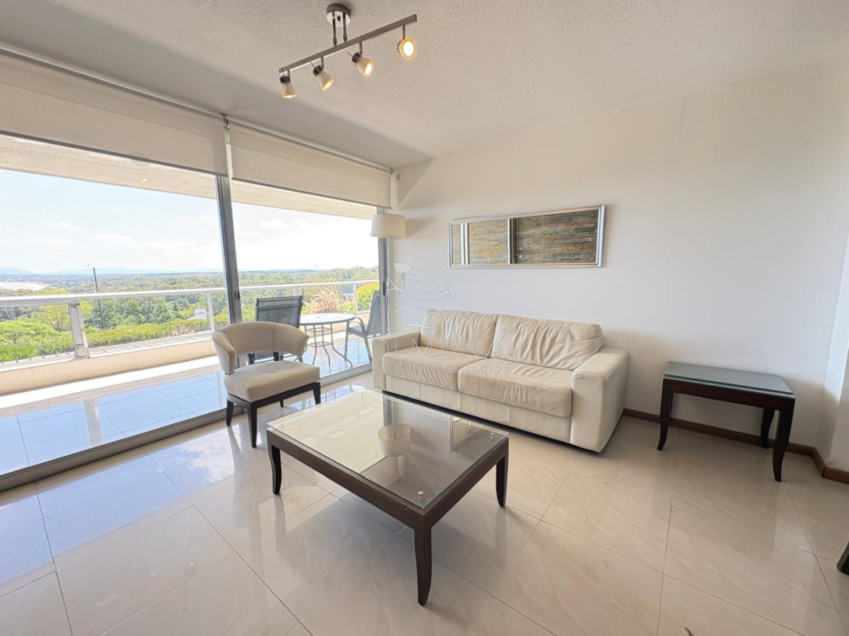 Apartamento con vista al mar, se alquila anualmente. Vista al mar, cerros y al atardecer. Dispone de 2 dormitorios (1 en suite), 2 baños, cocina definida con terraza lavadero, living-comedor, estufa a leña y aire acondicionado en living y dormitorios. Cuenta también con parrillero, balcón, 2 garajes, depósito, piscina, salón de uso común, solárium y deck exterior para uso personal. Completamente amueblado. Tiene una superficie total de 107 m2. Se encuentra en Rinconada, Punta Ballena. GarantÃa de aseguradoras. Costo mensual: $ 39.000, más gastos comunes de $12.000. Comisión inmobiliaria 1 mes de alquiler + IVA. ¡Para agendar una visita u obtener mas información, no dude en escribirnos!.