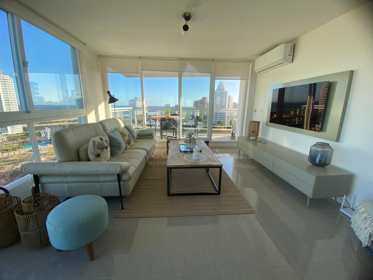 Tu Refugio en Punta del Este: Elegancia y Confort a Pasos del Mar Descubre este encantador apartamento ubicado a solo 200 metros de la playa, en el corazón de playa brava. Con una superficie de 95 m², esta unidad de 2 dormitorios y 3 baños (2 suites), un toilette, es ideal para disfrutar de momentos inolvidables en familia o con amigos, con capacidad para 4 personas. **CaracterÃsticas del Apartamento:** - **Cocina Definida**: Equipamiento completo que incluye cocina eléctrica, microondas, heladera con freezer, licuadora, tostadora, cafetera, lava ropas , lavavajilla, etc. - **Living Comedor**: Espacio luminoso y acogedor, perfecto para relajarse después de un dÃa de playa con muy fina decoracion, tv smart, aire acondicionado, cortinas todo a estrenar. . - **Confort Adicional**: Aire acondicionado, WiFi, lavarropas y lavavajillas, tv smart, wi fi, ropa blanca para una estancia sin preocupaciones. Este espectacular departamento le ofrece en la azotea un parrillero de 95mts con vistas inmejorables a playa mansa - brava , el mismo cuenta con proyecto aprobado por consorcio para mejoras, también puede contar con una cochera extra. **Amenities que Enriquecen tu Estancia:** Disfruta de una variedad de instalaciones que elevan tu experiencia: - **Piscinas**: Climatizada, cerrada y abierta, ideales para disfrutar todo el año. - **Gimnasio y Spa**: Sauna seco y húmedo, para relajarte después de un dÃa activo. - **Espacios Comunes**: Lobby, recepción, porterÃa, barbacoa, cancha de tenis y paddle, asà como un playroom - sala de juegos para los más pequeños, servicio de mucama diario. - **Seguridad y Comodidad**: Vigilancia 247, mantenimiento y estacionamiento. Con un servicio de playa que te permitirá disfrutar del sol y la arena sin preocupaciones, este apartamento es la opción perfecta para quienes buscan un estilo de vida relajado y sofisticado en uno de los destinos más exclusivos de la costa uruguaya. **¡No dejes pasar esta oportunidad!** Consulta con nuestros asesores para más información y para agendar una visita. Tu nuevo hogar en Punta del Este te espera.